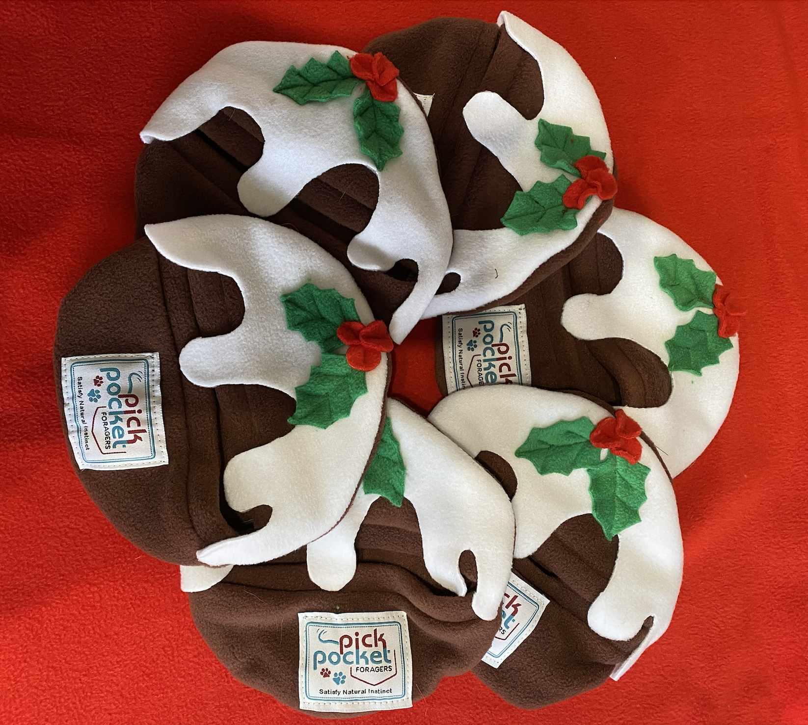 Our Christmas figgy pudding foraging pouches are a limited edition foragers for the Christmas season. Bought individually or as a set, our highly versatile figgy pudding pouches can be used as a stand alone product or can be tucked inside other products such as the caterpillar or foraging bag for added enrichment to create a more challenging foraging environment. Each pouch can also be filled with treats and hidden separately for your dog to search for or for none food enrichment, try filling them with sheep’s wool.